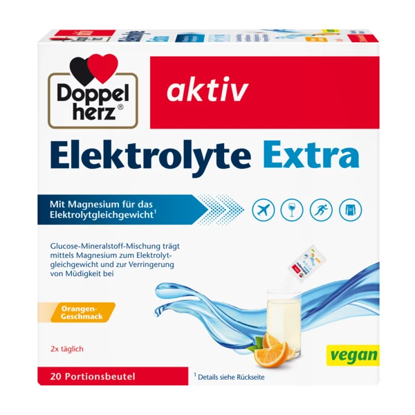 Допелхерц Актив Електролит с вкус на портокал възстановява водно-електролитния баланс и подпомага бързата хидратация на организма при натоварване, изпотяване, загуба на течности и умора. Формулата осигурява ключови минерали – магнезий, калий, натрий и хлориди – които поддържат мускулите, сърцето и нервната система. Глюкозата улеснява усвояването на електролитите и предоставя бърза енергия.