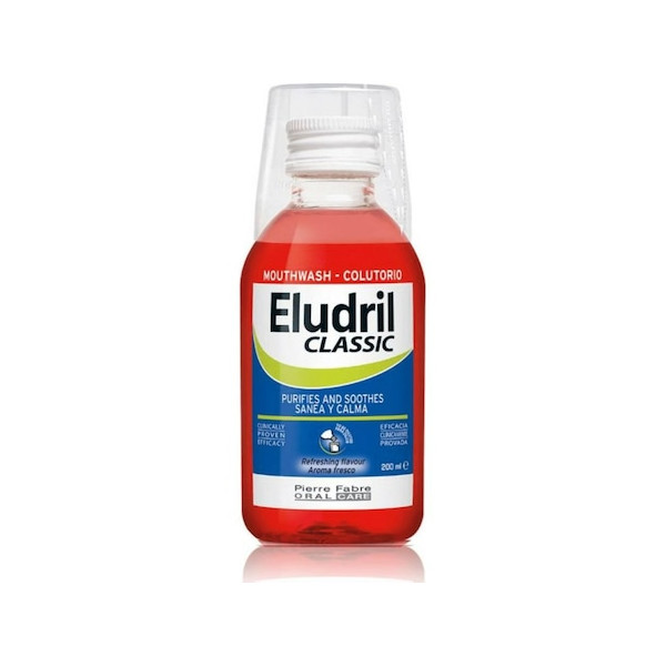 Комбинирана формула с почистващо и успокояващо действие, която допринася за поддържането на добра орална хигиена, ограничава риска от бактериален растеж и допринася за заздравяването на венците. С клинично доказана ефикасност, тествана под стоматологичен и педиатричен контрол. Вода за уста ELUDRIL CLASSIC може да се използва като допълнително средство при пародонтална и имплантологична терапия. Подходяща е за пациенти с ортодонтски апарати, зъбни протези или импланти.