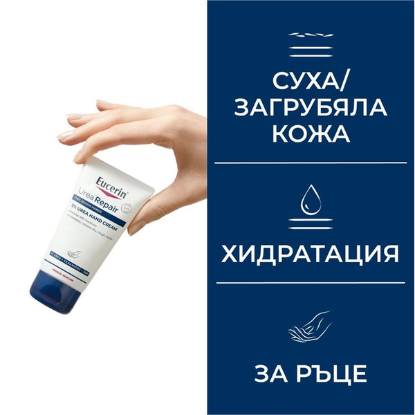 Защитете ръцете си от изсушаване с двойния комплект Eucerin UreaRepair Plus. Този крем е специално формулиран за суха и груба кожа, която е подложена на чести външни агресори като вода, студ и химикали. Уникалната комбинация от 5% урея, серамиди и NMF задържа водата в кожата и подсилва естествената й защита. Резултатът е мека и гладка кожа с дълготраен комфорт. Продуктът е с отлична ефикасност и поносимост, подходящ и за зряла кожа.